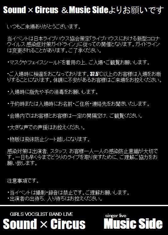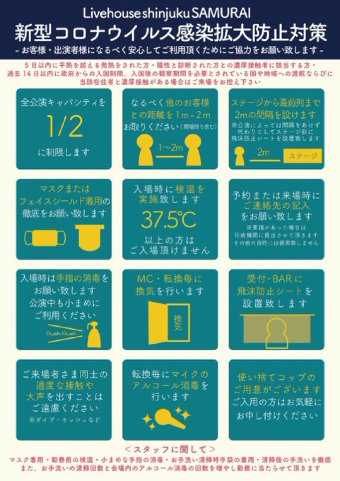 大変堅苦しいお願いで不本意でありますが、ライブハウスから感染者を出さないため、一日も早く従来のライブを出来るようにするためにご協力をお願いします。
