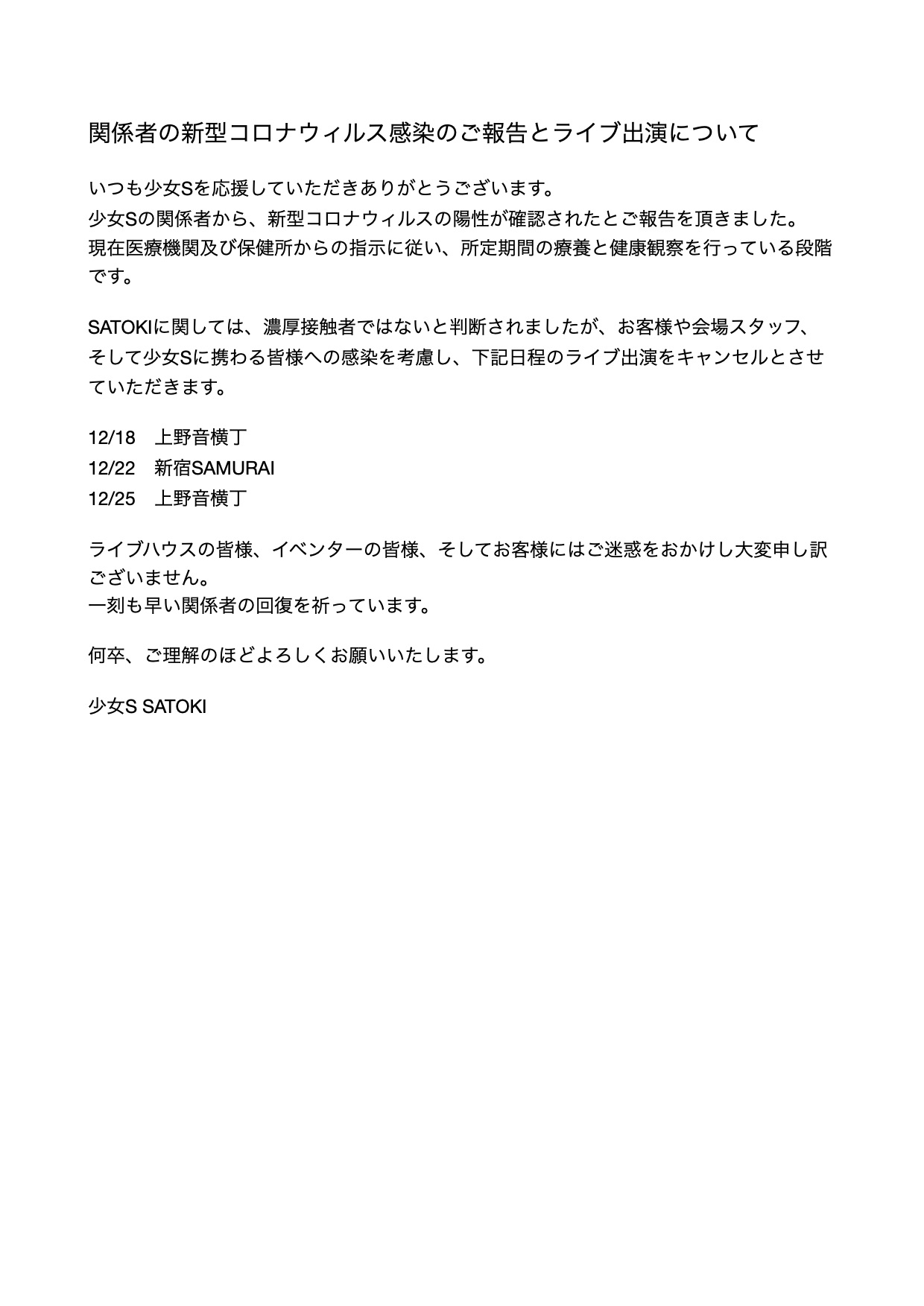 その際には少女S Twitter(@shoujo_official)をご確認頂きますようお願いいたします。